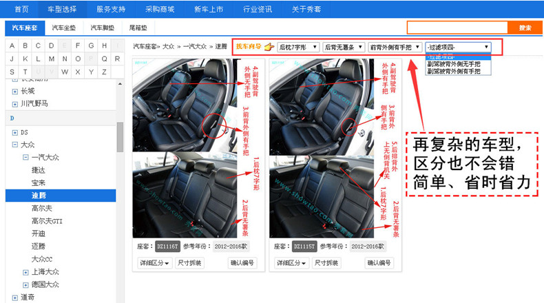 从消费者和经销商的角度出发,利用“实体照片+网络发布”方式代替行业原有的“示意图+纸质一年印刷一次”的车型区分方式,简单易懂新车更新及时。秀套网通过统一建立车型编号,提高了消费者、各级经销商与用品生产企业之间的沟通效率,大幅度地降低了沟通差错,帮助用品生产企业减少运营成本。